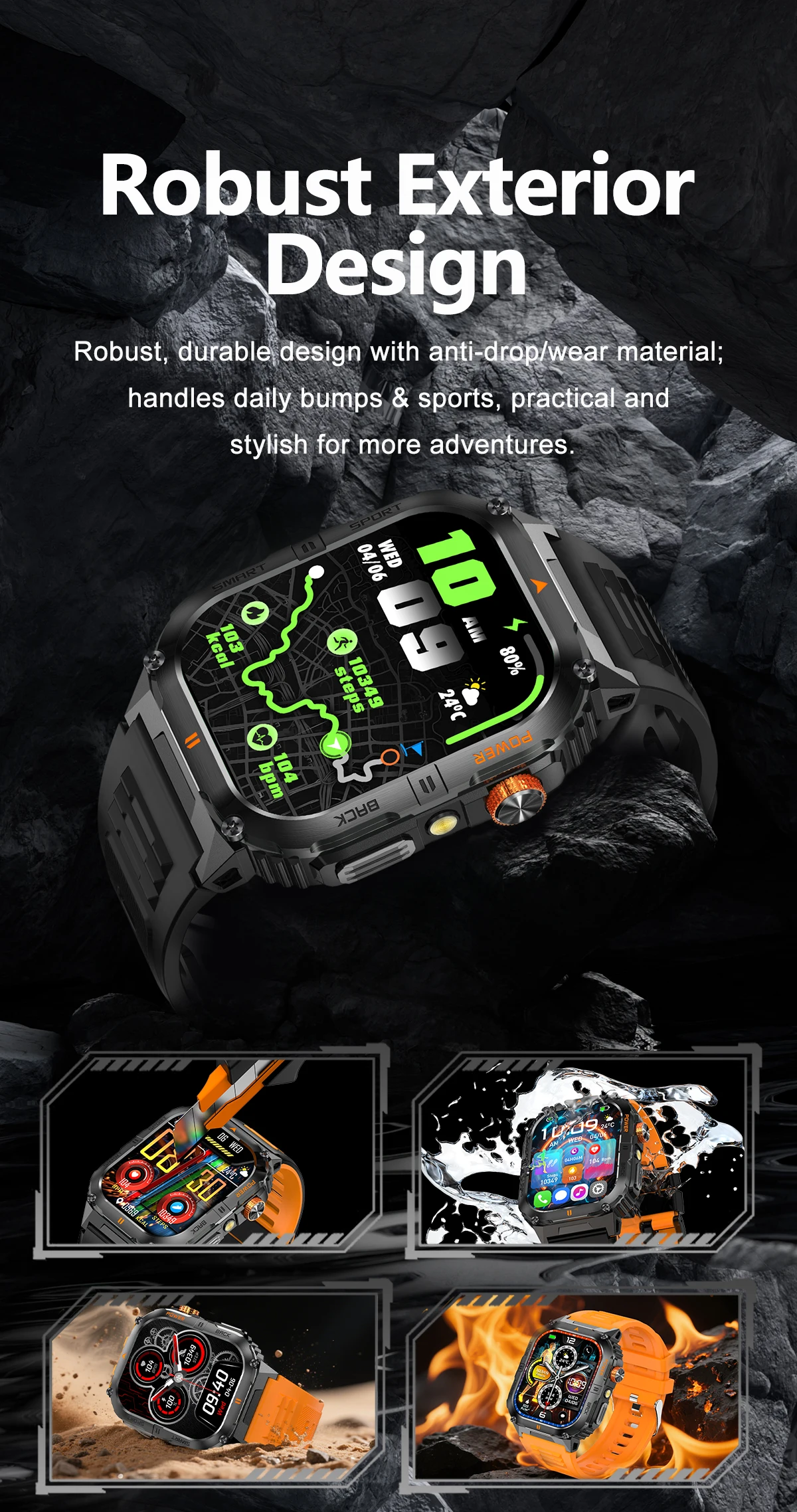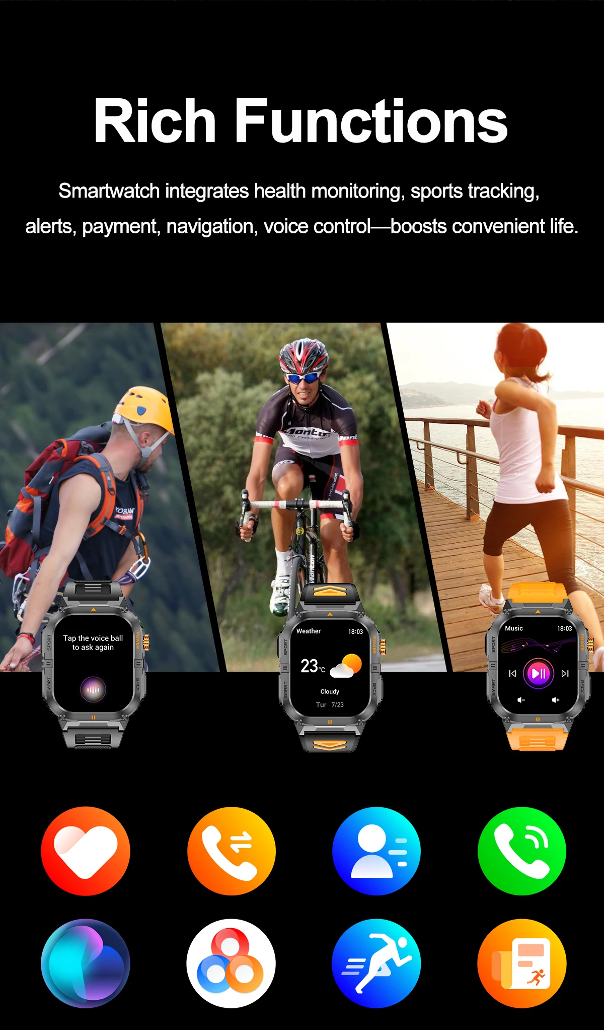 Basic Functions: GPS track, compass, custom dial, heart rate, phone book, Bluetooth dialing calls, blood oxygen, blood pressure, weather, health three rings, workout records, workout (cycling, running, soccer, badminton, walking, climbing, swimming, basketball), music control, sedentary reminder, sleep monitoring calculator, remote photo, stopwatch, find cell phone, messages, restore factory settings, settings (Siri, language, time, version number, Bluetooth name, backlight time, return to dial, bedside light, off screen switch), lift wrist bright screen, alarm clock, frequently used contacts, backlight time, return to dial, bedside light, off screen switch. Settings (Siri, language, time, version number, Bluetooth name, backlight time, return to dial, bedside lamp, screen off switch), lift wrist to light up the screen, alarm clock, frequently used contacts, etc., support pedometer analysis, voice broadcasting, key with encoder